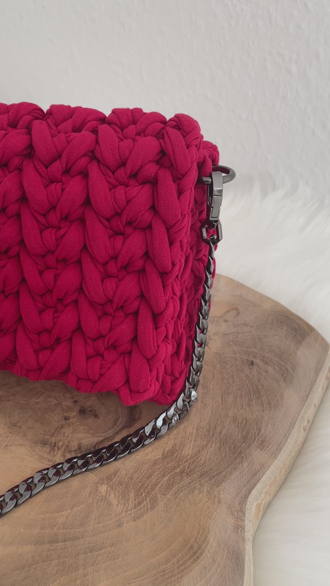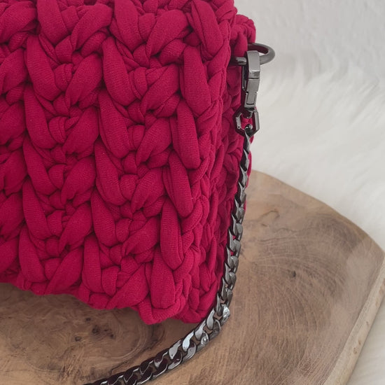 Indulge in luxury with the Amalia Handbag. Handmade with premium t-shirt yarn (100% cotton), this bag boasts an elegant crochet design and can be used with a vegan leather or metal strap. Each bag is unique and stunning, made with European materials to ensure high quality.