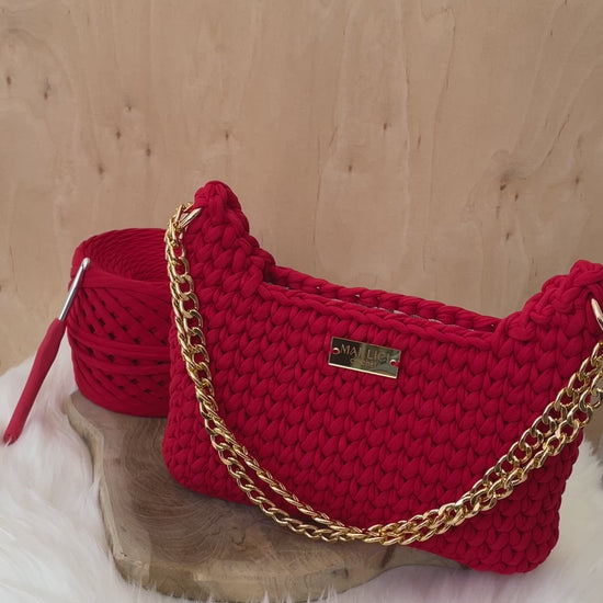 Indulge in luxury with the Maya Handbag. Handmade with premium t-shirt yarn (100% cotton), this bag boasts an elegant crochet design and can be used with a vegan leather or metal strap. Each bag is unique and stunning, made with European materials to ensure high quality.